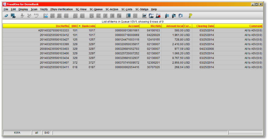 Displays the last selected (current) SignCheck List. You can scroll through the list by using the cursor or the UP/DOWN keys. By typing ENTER or SPACE or double-click you can show the selected document in the View Current Queue. Depending on the configuration and the status of the document inside the workflow you can make a decision to this document or not.