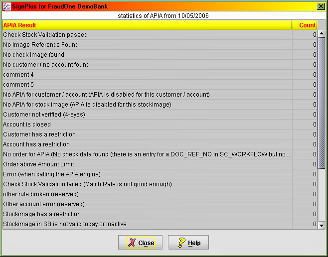 In this menu, you obtain information on the results produced by Automatic Payment Image Analysis (APIA). In the left column, all current decision possibilities are listed. In the right column, you see how many cheques have caused each result. These statistics consider all present BNOs.