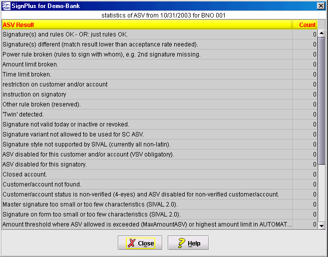 In this menu, you obtain information on the results produced by automatic signature verification (ASV). In the left column, all current decision possibilities are listed. In the right column, you see how many cheques have caused each result. With the window scroll bar, you can move to additional decision possibilities that are not currently displayed. These statistics consider all present BNOs.