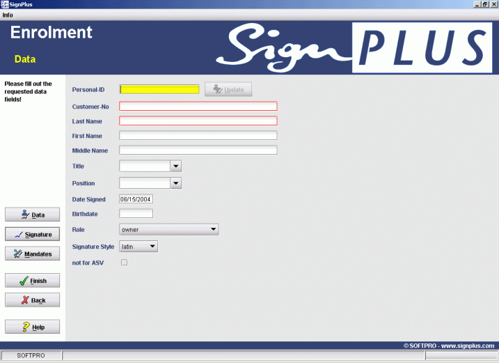 Personal ID identifies the Signatory. You can specify the Personal ID and press Update button. If specified Personal ID exists in database, all the fields will be automatically filled with the data corresponding to this signatory. If Personal ID does not exist appropriate message will be shown.