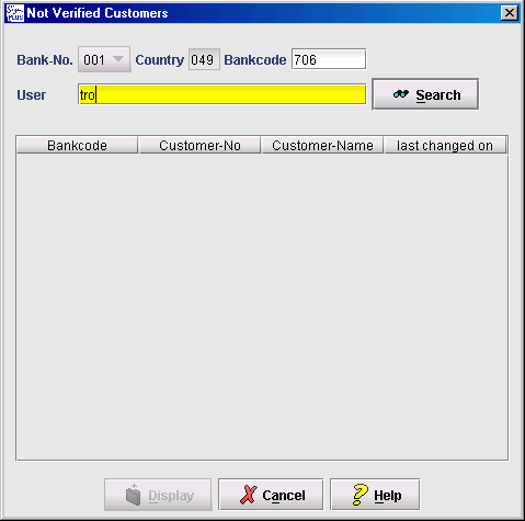 In this dialog, you can search for customers who have not yet been verified. The country identifier, the bank code and the recorder's User-ID can be entered for the search. Selecting the Search button causes the search to begin.