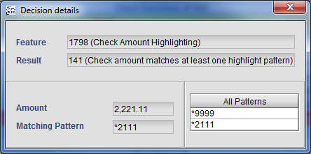 Highlight patterns help to match suspicious values of cheque amount, account, or branch/transit code. The patterns can be edited via SignBase Edit menu, as specified in Highlight Patterns.