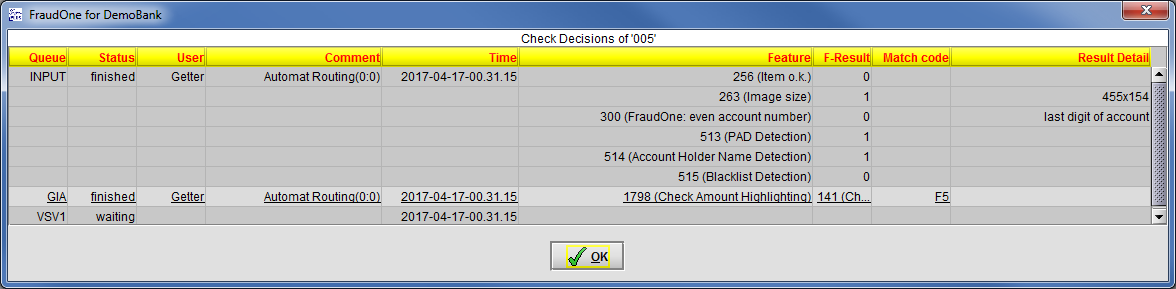 Depending on a workflow determined by the current CRS a cheque undergoes several automatic and/or visual examinations. In the result of examinations in technical queues automatic services assign one or another feature result. Usually a fraud analyst receives a cheque already with a baggage of feature results taken earlier in other queues. This information is supposed to help the fraud analyst to take her/his own decision.