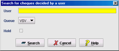 With this menu, you are able to search for cheques that are already decided by a user. Therefore, you have to select a specific queue. If the checkbox 'Hold' is marked, all cheques will be displayed, which were set on hold from the specified user in the selected queue.