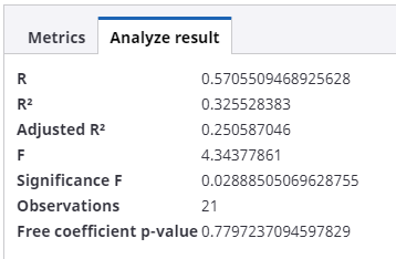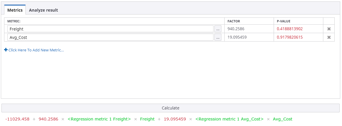 After the regression analysis is performed, the FACTOR and P-VALUE columns are populated with the results and the metric formula is displayed at the bottom of the page.