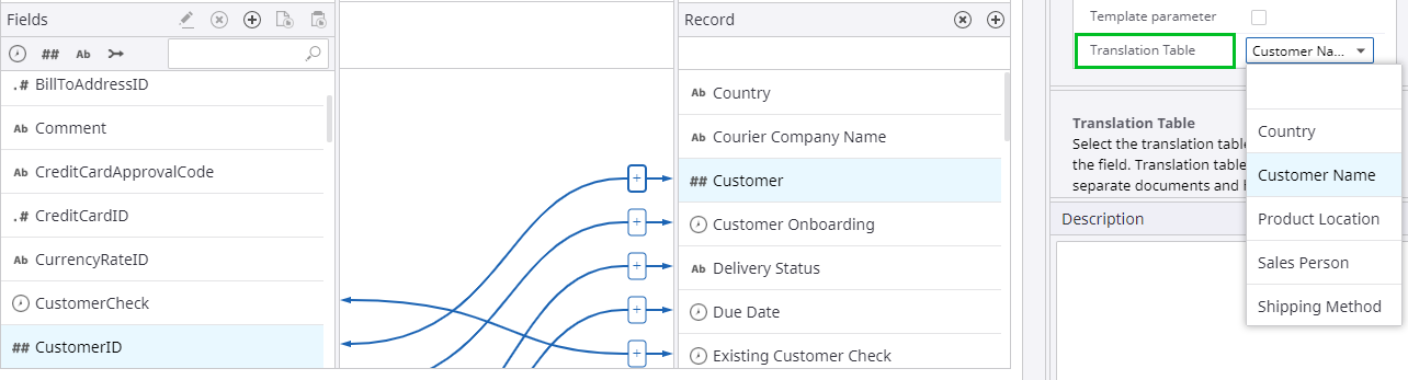 In cases when a record is based on another document bound with a translation table, this connection is inherited. For example, if a record field is mapped to the translation table, and then another record is built on this record, this field is automatically linked to the translation table. In this case, you can change the translation table via the Property Panel.