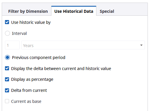 Selected check boxes when the historical period is set (either as an interval or as the previous component period)