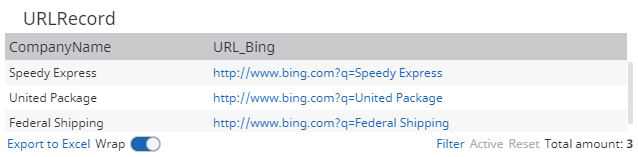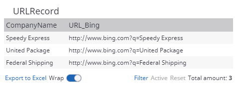 For the URL link: If the URL Field property is selected, the link appears in the grid as an active link.