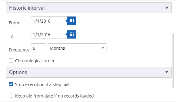 - Select the The previous batch finish time option to record the time before dataload is executed as a historic date.
