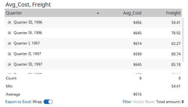 You can apply sub-aggregations to your data to see some aggregated functions based on the selected data series or applied to the whole component. In the later case, sub-aggregations are calculated for each data series in the component, plus for those data series where sub-aggregations are manually added. Possible aggregated functions include: