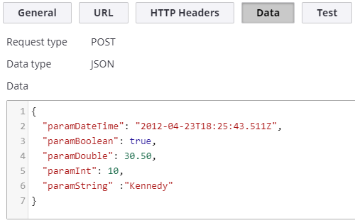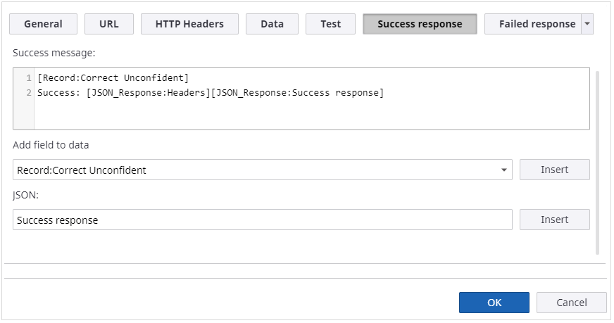For the JSON data type and POST request type, you can also configure the success of failure message that appears after the web service call is performed. Success messages are sent for the HTTP response = 200 (OK) and failure messages are sent for the HTTP response = 500 (server error).