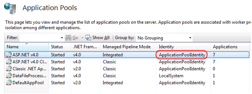 - On the Application Pools page, select the Application Pool that contains the WCFDataService. Note: To view all the applications in the Application Pool, click View Applications in the Actions pane.