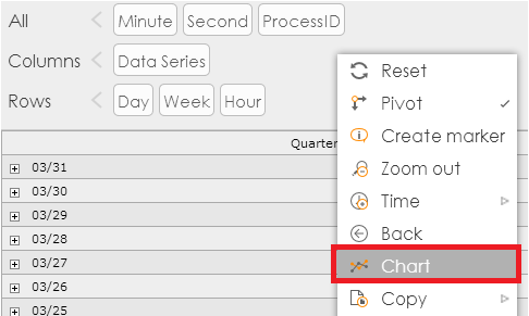 Use pivoting to move dimensions along rows or columns to change the information displayed, and the order in which it is displayed. Pivoting is available for charts, metric grids and scatter charts. Pivot tables are not available for record grids.