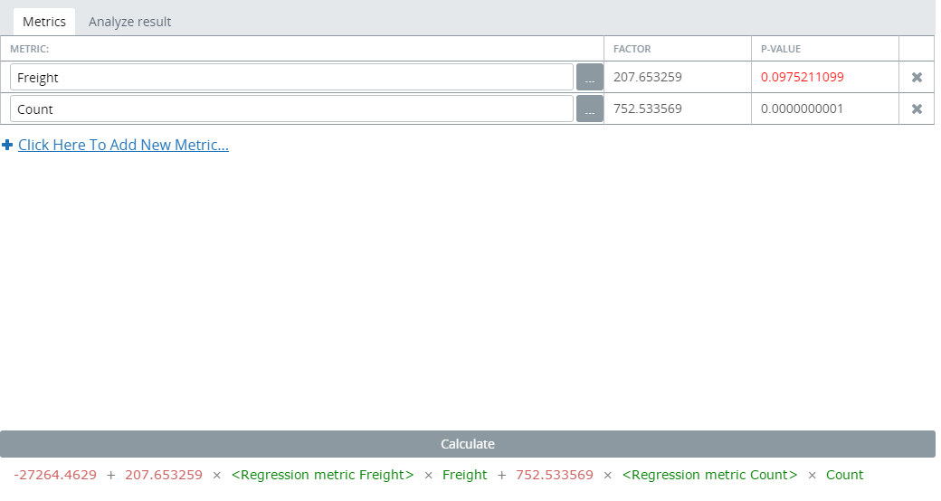 After the regression analysis is performed, the FACTOR and P-VALUE columns are populated with the results and the metric formula is displayed at the bottom of the page.