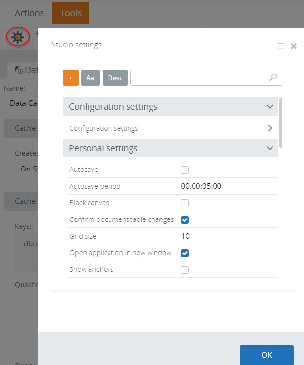 Use Studio settings to set configuration, personal, scheduler, and global preferences within Studio.