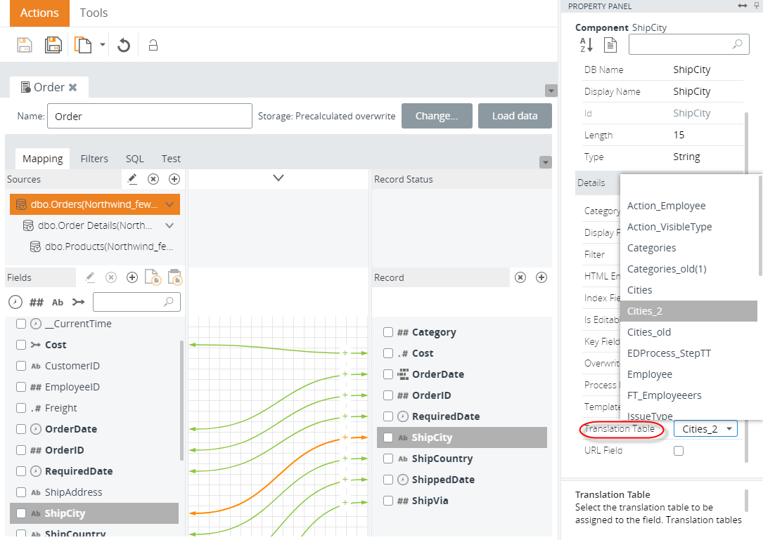 In cases when a record is based on another document bound with a translation table, this connection is inherited. For example, if a record field is mapped to the translation table, and then another record is built on this record, this field is automatically linked to the translation table. In this case, you can change the translation table via the Property Panel.