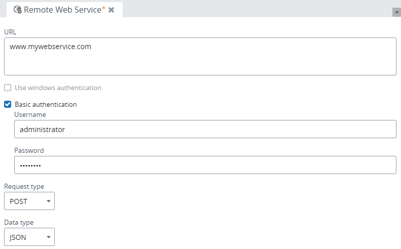 You can provide the URL, request type, and if it is "POST," specify the data type (HTML, JSON, XML, or text). Optionally, you can add the basic authentication parameters or Windows authentication.