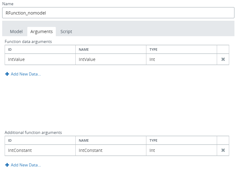 See the sample screen below: the function uses no model (the Model line is empty) and has InputData and OutputData names defined manually.