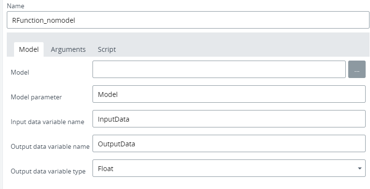 - Model parameter (optional): Specify the name for the R model variable to be used in the R script.
