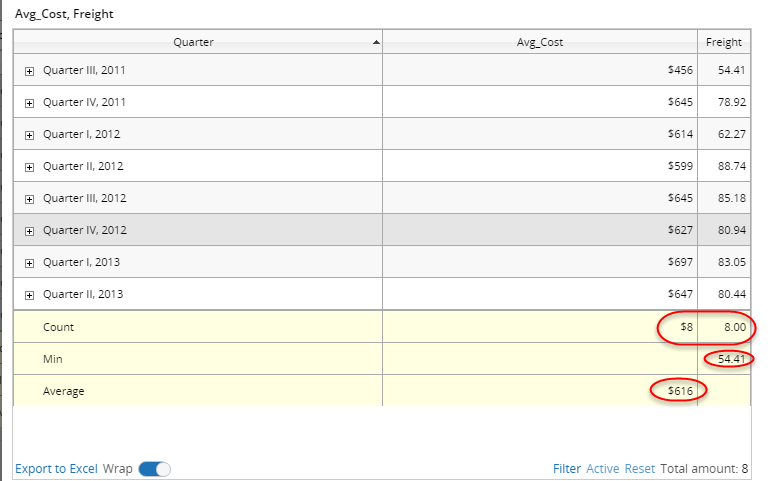 Note In the sample screen shot, we selected "Count" for the whole grid, "Average" for the first data series (Avg_Cost), and "Min" for the second data series (Freight). -