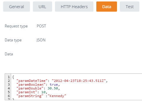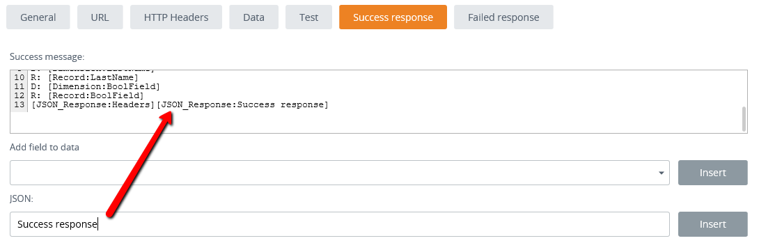 For the JSON data type and POST request type, you can also configure the success of failure message that appears after the web service call is performed. Success messages are sent for the HTTP response = 200 (OK) and failure messages are sent for the HTTP response = 500 (server error).
