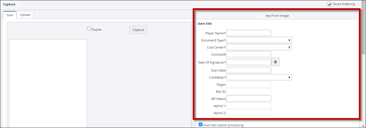 You can update the details of an item while uploading it into the application. While using the Scan or Upload option, you can select Quick Indexing to provide the details of the item being scanned or uploaded.