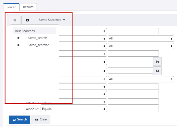 The search is saved and appears in the list of saved searches. Click Saved Searches to view the list.