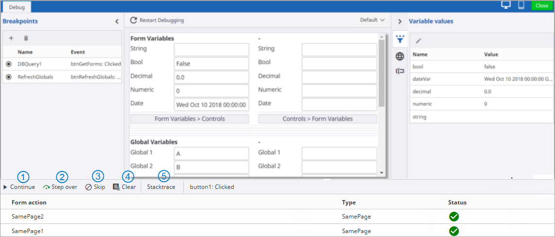 When you reach a breakpoint, you can expand any server side action, such as .Net action and view and update the values of controls, form and global variables and continue execution.