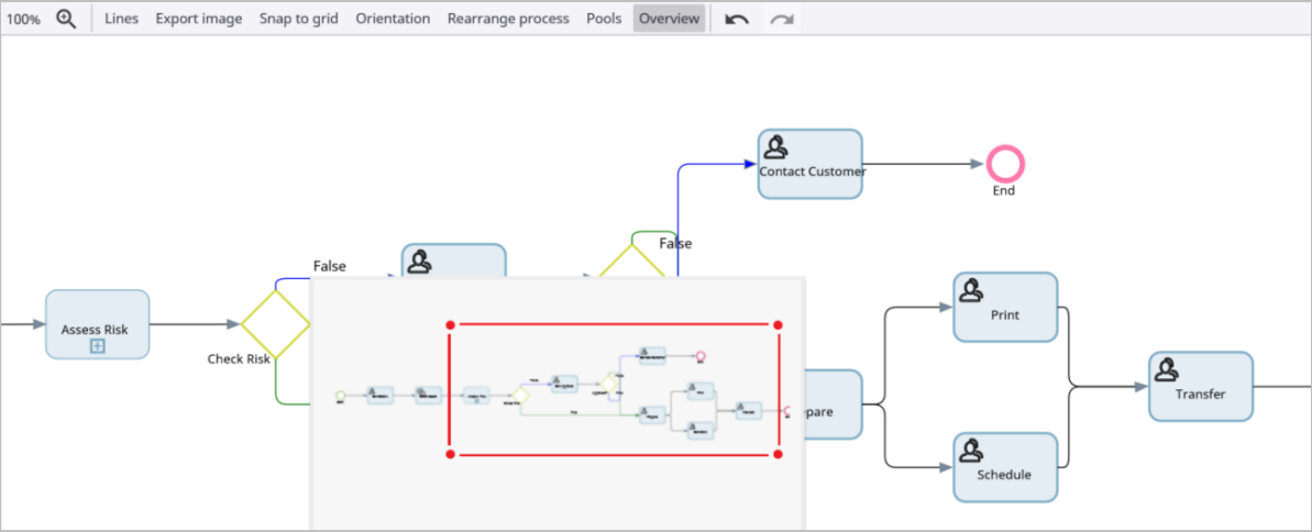 Displays an overall picture of a large process in a panel. You can also navigate (pan or zoom) to a particular activity using the mouse. See the following image for Process Overview Panel.
