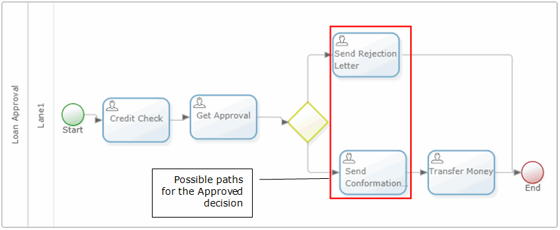 A decision is a point in a process to select the path the business process must follow. The selected path depends on the evaluation of one or more conditions (decision rules).
