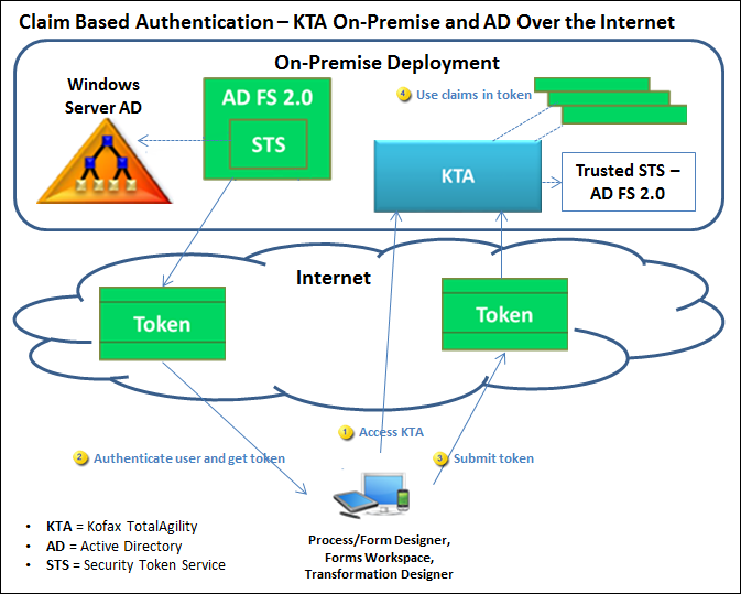 This scenario describes TotalAgility on-premise with local Windows server AD FS 2.0 (as identity provider) accessed over internet.
