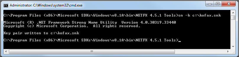 - Type sn -k <name of the key file>.snk (for example, sn -k kofax.snk).