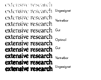 Die Helligkeitseinstellung spielt eine wichtige Rolle bei der OCR-Genauigkeit. Überprüfen Sie nach dem Laden eines Bilds dessen Aussehen. Sind die Zeichen dick und verlaufen ineinander, stellen Sie eine höhere Helligkeit ein. Sind die Zeichen dünn und unterbrochen, stellen Sie eine geringere Helligkeit ein. Verwenden Sie zur Optimierung des Bilds das Werkzeug OCR-Helligkeit. Das folgende Diagramm zeigt, wie die optimale Helligkeit ermittelt werden kann.
