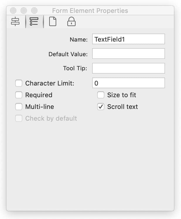 Kofax Power PDF for Mac le permite editar varias propiedades de los elementos del formulario en la pestaña Propiedades del elemento del formulario del Inspector. El contenido de la ventana varía en función del elemento del formulario seleccionado.