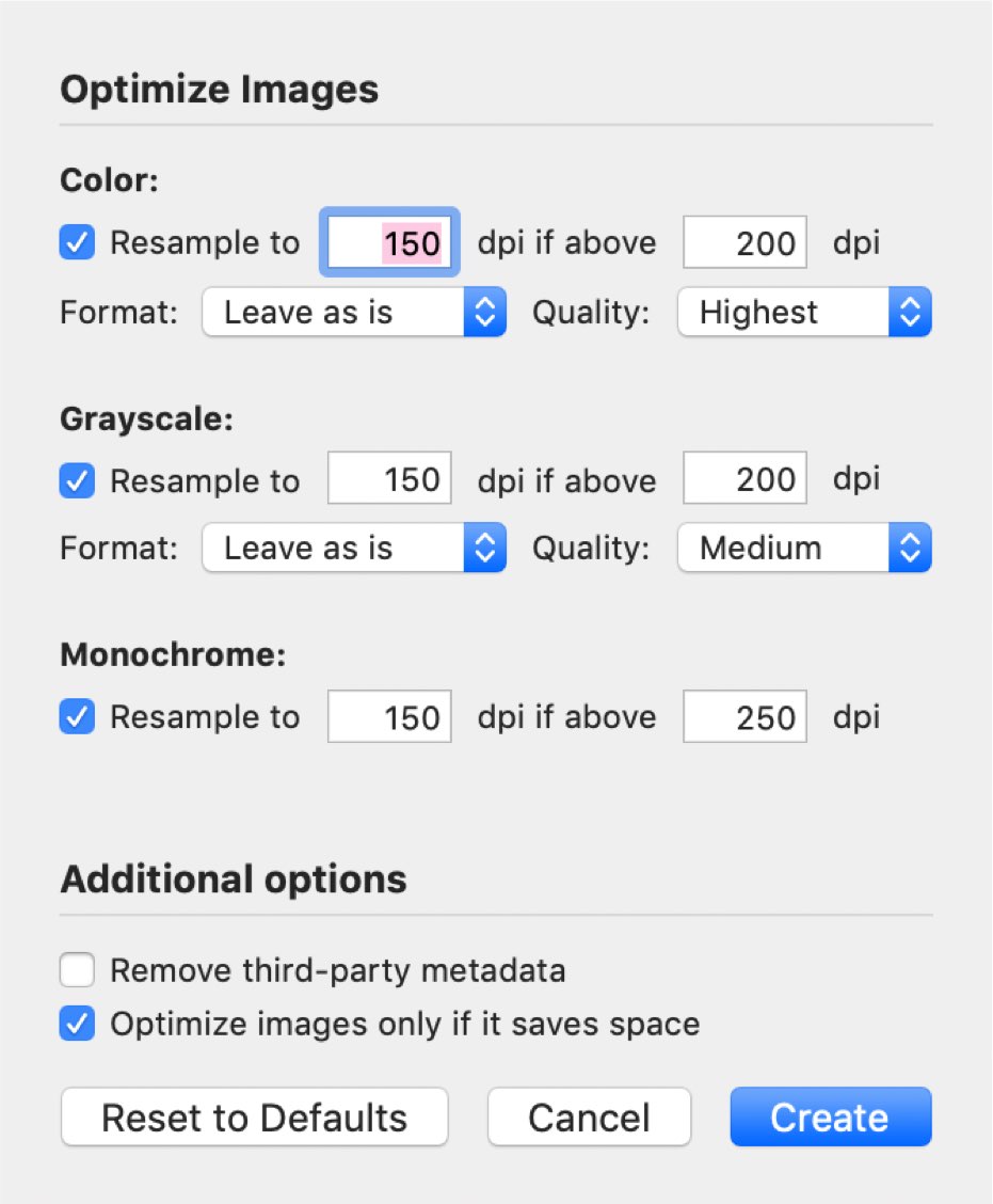 En Archivo > Guardar como, es posible especificar un filtro de cuarzo para la compresión del documento. Se pueden personalizar en la aplicación ColorSync Utility de la carpeta Utilidades de macOS. Es posible experimentar con la creación de diferentes filtros de cuarzo para ver si ofrecen mejores resultados.