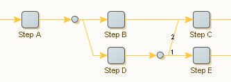 This robot illustrates how connections can be explicitly ordered. In this robot, the branches of step D are executed in the order specified by the numbers: step E is executed before step C. If an order is not specified (by numbers), connections are executed top-down. Thus, assuming that there are no test steps, that no errors occur, and that each step generates exactly one output robot state, the robot is executed as follows: A, B, C, D, E, C. The first time step C is executed, it receives the output robot state produced by step B; the second time step C is executed, it receives the output robot state produced by step D.