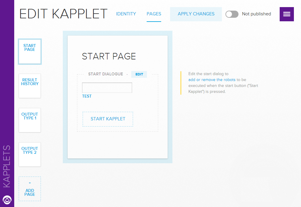 Note The Start Page and the Result History Page are mandatory. These pages govern how input is collected for the Start Action and how the result history is shown, respectively.- Configure the Start Page.