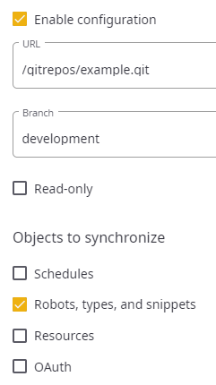 4. Under Objects to synchronize, select the objects to include in the synchronization: Robots, types, and snippets.