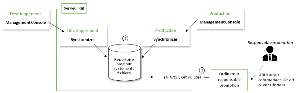 Nous vous recommandons d'exécuter les deux instances du Synchronizer sur le même ordinateur où le répertoire est stocké (1). Grâce à cette configuration, le responsable de la promotion peut utiliser l'une des normes du protocole Git (2) pour accéder au répertoire et pousser les changements vers la production.