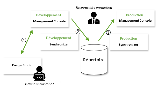 Dans cet exemple de configuration, le développeur de robot établit la synchronisation (1) avec un projet stocké dans le développement Management Console, crée de nouveaux objets ou apporte des modifications aux objets existants, puis synchronise à nouveau le projet avec ce Management Console.