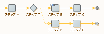 一方で、ステップ B でエラーが発生すると、ステップの実行は次のようになります:「A、T、B、T、D、E」。ステップ B のエラーが処理された後、実行は後続のステップで続行されず、代わりにトライ ステップから出ている次の分岐の開始時に続行されます。