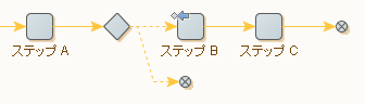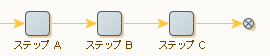 結果として、エラーが発生した場合にはステップ B より後のステップの実行がスキップされます。トライ ステップなしで、エラー処理オプション「後続のステップ全てをスキップ」(デフォルト) を以下の方法で使用しても同様の結果になります。
