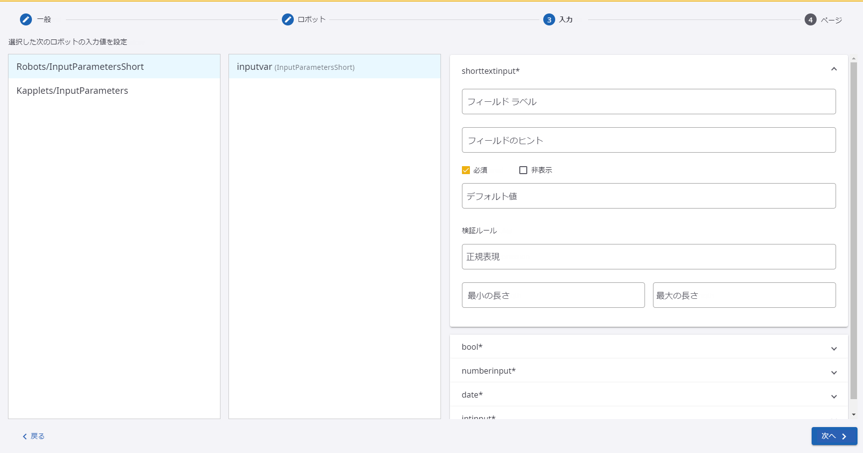 [入力] ステップ ページで、選択したロボットの入力パラメータを設定します。