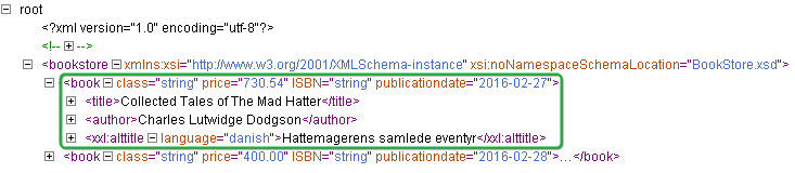 • 自身にサブ要素を含まない、選択した要素のサブ要素の属性。[ソース] の列では、このような属性は、要素名および属性名が < と > で閉じらている XML に似た形式で表示されます。