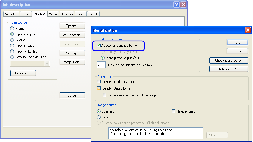 Used when is selected as the form source in the job description. Depending on the Identification value, decide what to do next— for example send another document to Interpret or end the job.