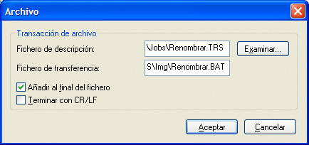 Seleccione Añadir al final del fichero en el cuadro de diálogo Archivo. Así podrá enviar datos de varias sesiones de Transfer al mismo fichero de proceso por lotes.
