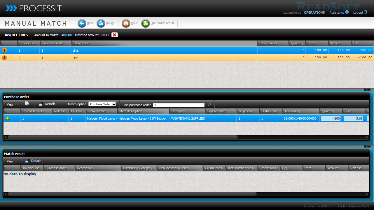 Use match result: Apply the performed line matching to the invoice and continue to Task Details.Contains invoice lines that require matching or have been matched.