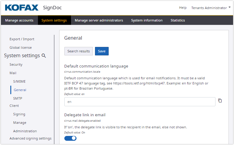 You can edit the settings directly in the search result list and click Save. If you click the title of a setting, the setting's category page opens where you can see the setting in its normal context. When entering a setting's category in this way, an additional Search results button is displayed that takes you back to the "Search and edit settings" page.